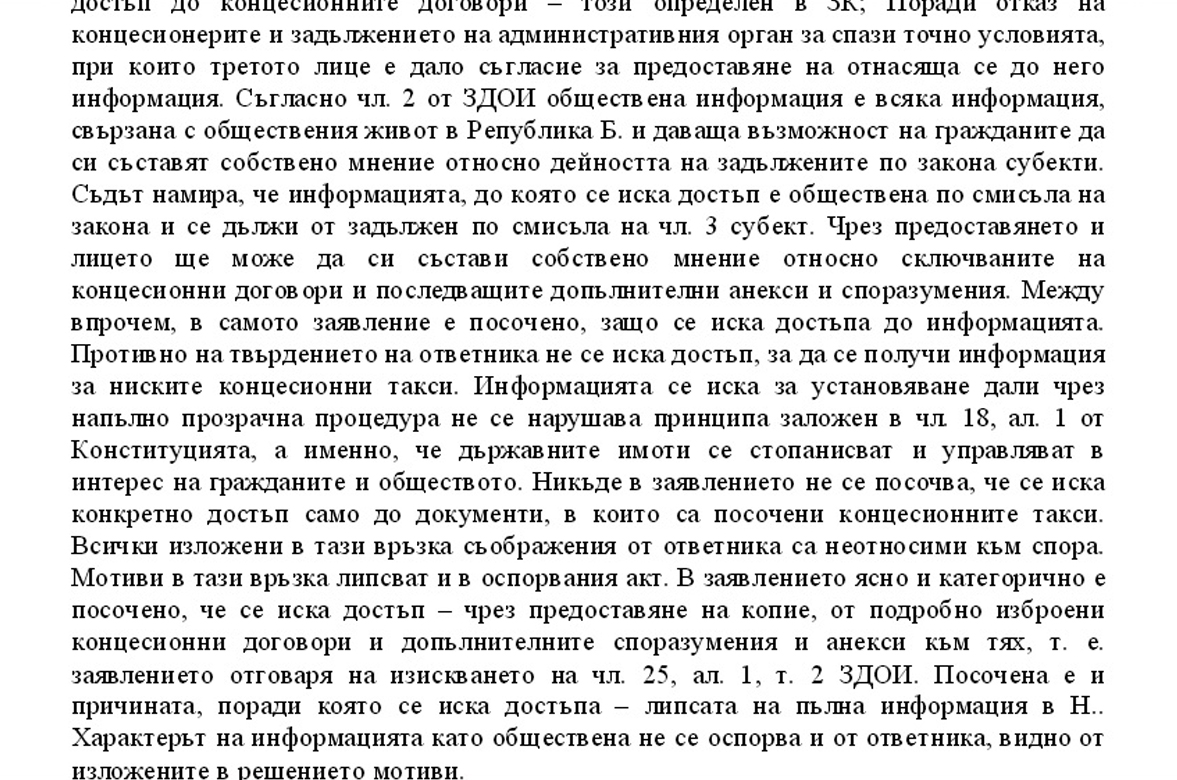 Една от стотиците български граждани, подали заявление за достъп до обществена информация за договорите за т.нар. златни концесии, и една от десетките, подали жалби за отказа от такъв достъп – Павлина Карабоюкова от Хасково, е спечелила делото, насрочено в Административен съд – София-град, по нейната жалба. Съдия Мария Николова от 32-ри състав на този съд е решила, че жалбата й е основателна и условията, при които са били сключени договорите на фирмите концесионери, не бива да бъдат държани в тайна от обществеността. Павлина Карабоюкова е била представлявана от адв. Папазова. Решението на съда е с номер 4588/3.07.2014 г. (Целият му текст може да се види тук – бел.ред.)
