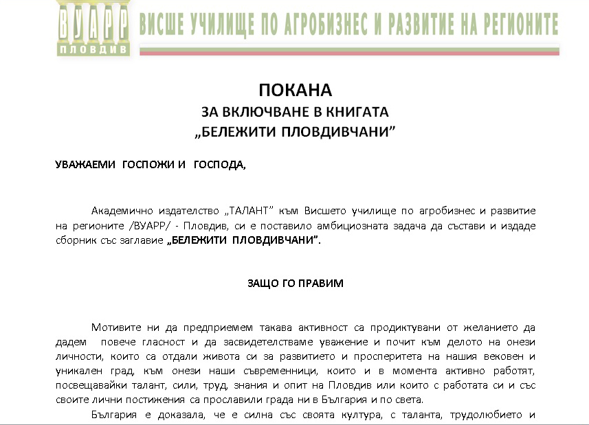 Академично издателство „Талант” към Висшето училище по агробизнес и развитие на регионите (ВУАРР) – Пловдив, е започнало да съставя сборник със заглавие „Бележити пловдивчани“, в който иска да събере възможно повече заслужили имена, свързани с Града под тепетата.