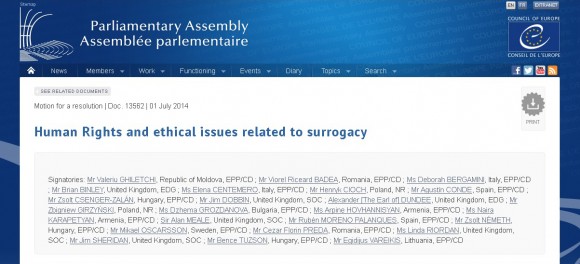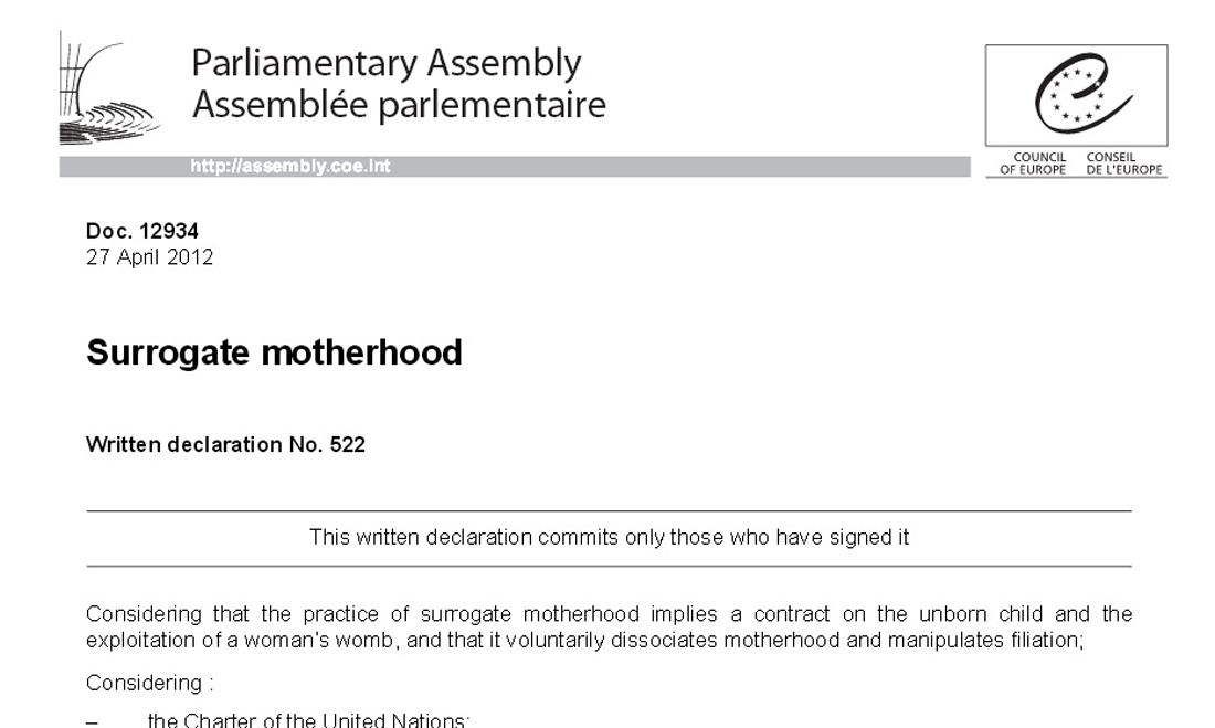 Общо 23 членове от Парламентарната асамблея на Съвета на Европа (ПАСЕ) внесоха предложение за резолюция относно сурогатното майчинство. В нея се казва, че сурогатното майчинство подкопава човешкото достойнство на жената, износваща плода, тъй като тя самата и репродуктивните функции на органите й се използват като стока.