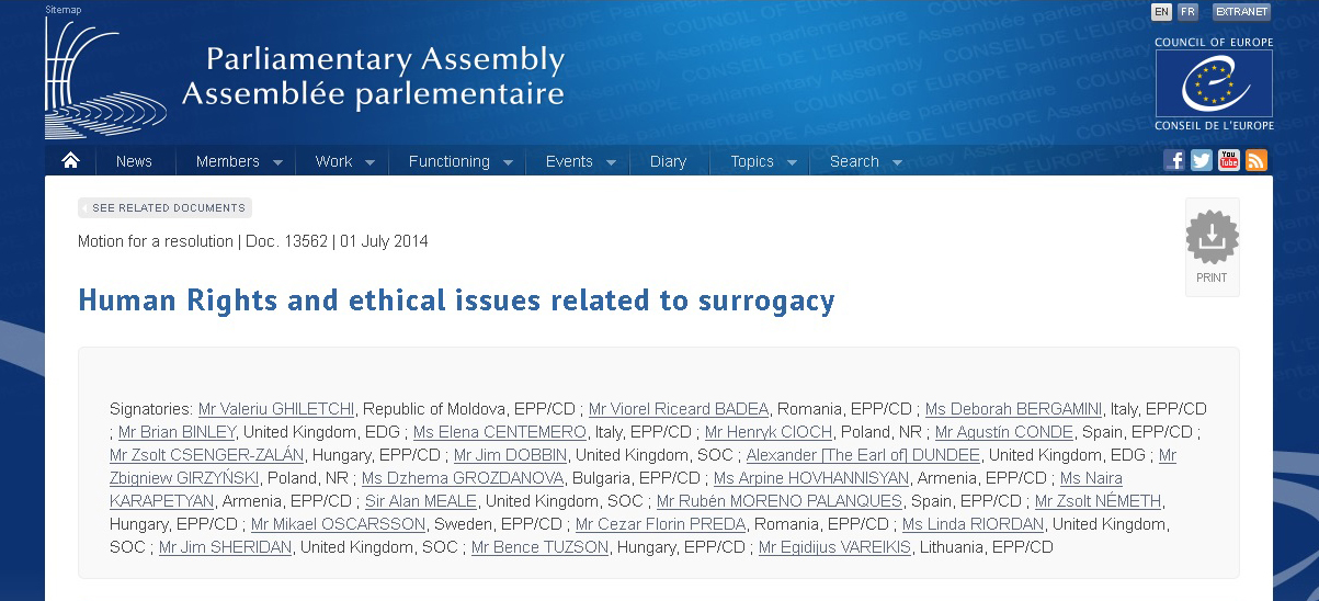 Две години по-рано 22 депутати от Европейската народна партия (ЕНП) и членове на Парламентарната асамблея на Съвета на Европа (ПАСЕ) подписаха декларация, в която потвърждават, че сурогатното майчинство е несъвместимо с достойнството на жените и засегнатите деца, и е нарушаване на техните фундаментални права.