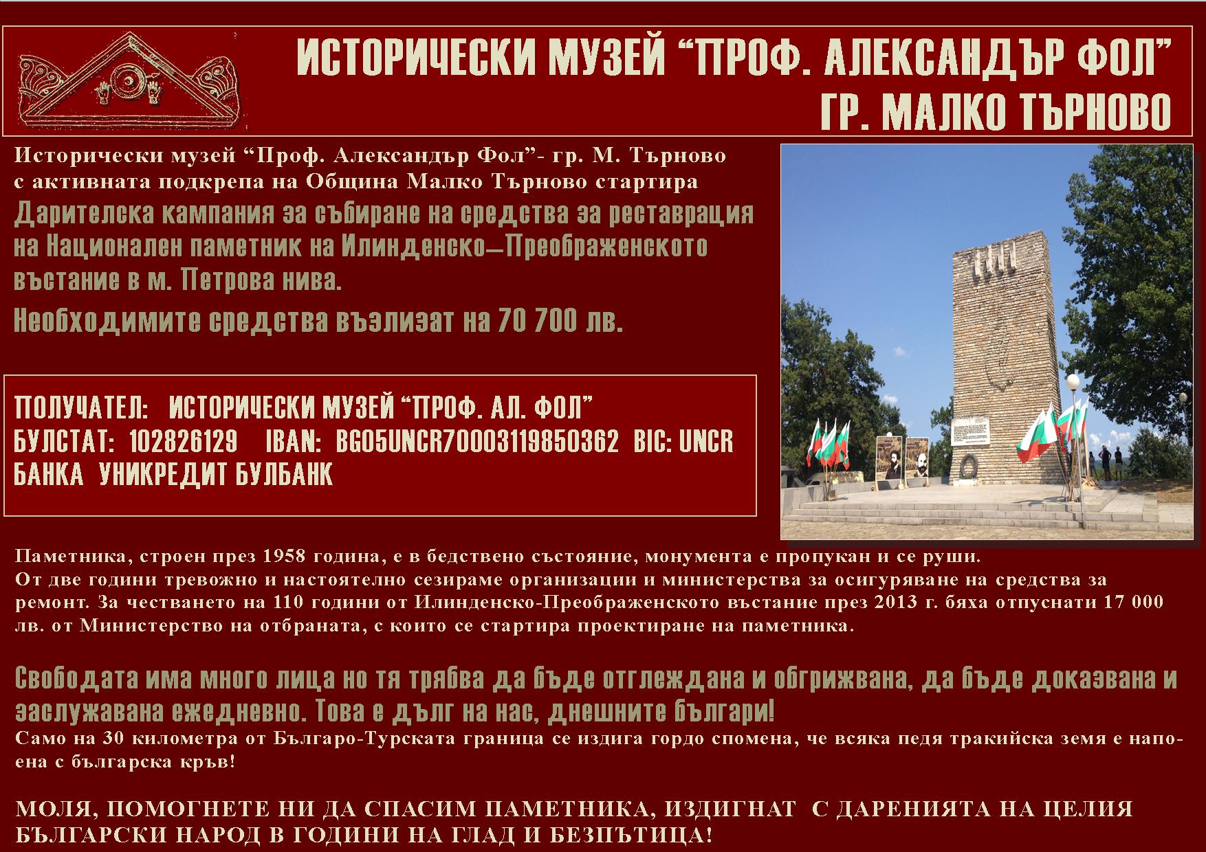 Уважаеми читатели, както ви информирахме неотдавна (вж. тук), историческият паметник на Илинденско-Преображенското въстание в местността Петрова нива край гр. Малко Търново се нуждае от сериозна реставрация, за която българската държава не е отделила достатъчно средства. Продължава да тече дарителска кампания за реставрацията на този паметник, инициирана от Община Малко Търново и местният Исторически музей. Повече за причините и смисъла на тази кампания и на значението на паметника на Петрова нива можете да прочетете в редовете по-долу, които съдържат кратка историческа справка и апел на Исторически музей „Проф. Александър Фол“ – гр. Малко Търново.