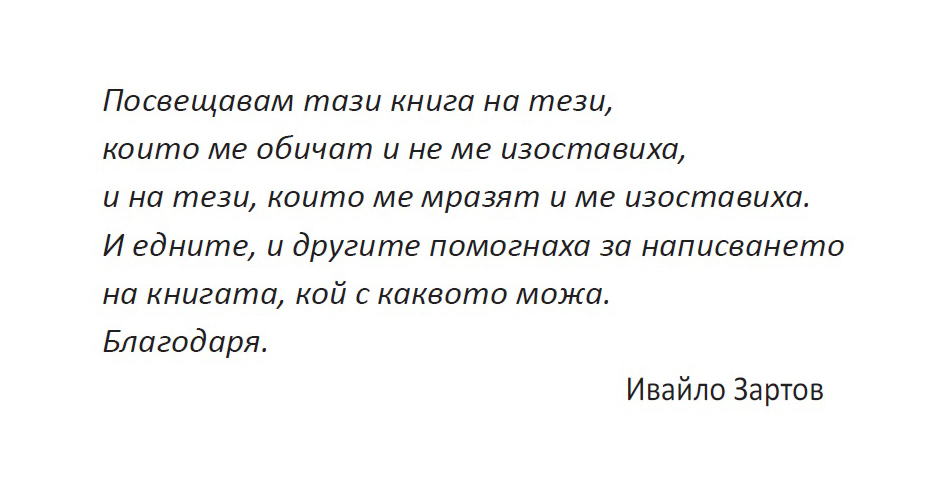 Ивайло Зартов е икономист, общественик и публицист. Като публицист Зартов е може би ако не единственият, то най-активният автор на остро критични социални и политически есета в България в наше време, който се намира зад решетките. Роден е в София през 1966 г. Завършил е УНСС, специалност „Прогнозиране и планиране на социално-икономически системи”. Владее свободно няколко езика. Занимавал се е с бизнес в областта на недвижимите имоти, както за кратко и с политика, като заместник председател на две социалдемократически формации. Никога не е бил на държавна служба. Финансирал е множество благотворителни и културни инициативи. Помагал е на детски градини, училища, читалища, детски спортни школи, певчески и танцови състави, пенсионерски клубове, църкви, манастири, на диабетици, онкоболни, незрящи и др. В последните години той е написал стотици политически, социални и сатирични текстове, осмиващи с тъжен хумор несправедливостта и гротеските в съдебния, политическия, икономическия и социален живот в България. Част от тях са представени на читателите в настоящата книга.