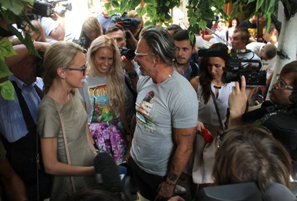 Приехавший в Москву Микки Рурк тоже побывал в ГУМе и приобрел футболку с изображением Владимира Путина. Актер надел обновку сразу после покупки, раздевшись по пояс на глазах у посетителей универмага.