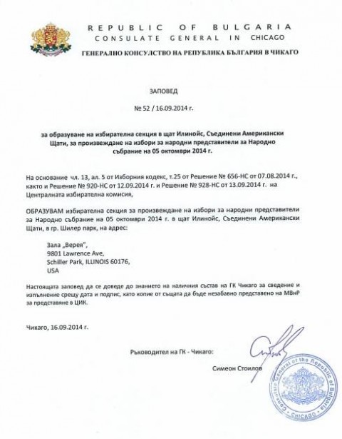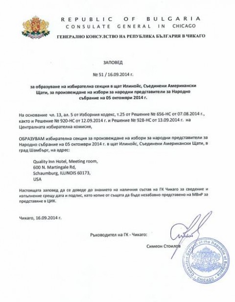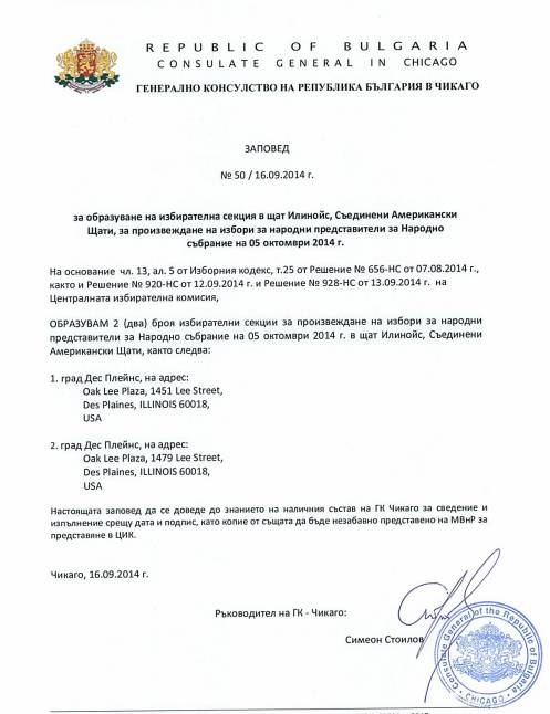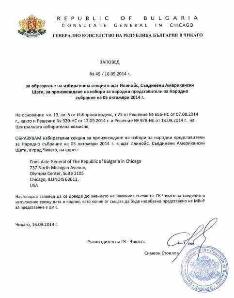 По-долу поместваме писмо на Генералния консул на Р. България в Чикаго Симеон Стоилов, което съдържа и линк към заповедите за образуване на избирателни секции за българските парламентарни избори на територията на САЩ.