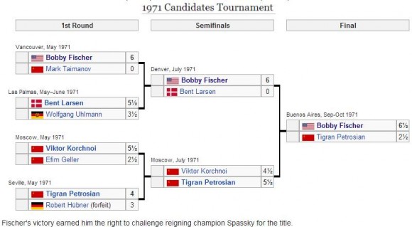 Спечелил е 7-те последни партии на финалния междузонален турнир, а след това е разгромил на два пъти Тайманов и Ларсен с по 6-0 и първата си партия в мача на претендентите с Тигран Петросян.