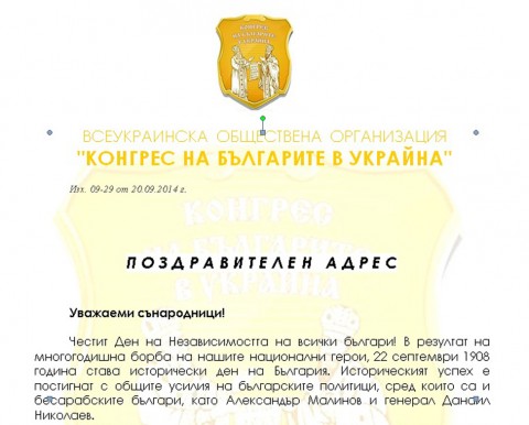 Уважаеми българи, от името на Всеукраинската обществена организация „Конгрес на българите в Украйна” ви пожелавам да сте живи, здрави и силни. Нека достойните постижения на нашите предци да бъдат подкрепа на вашите усилия и труд, насочени към развитие на силна и богата държава.