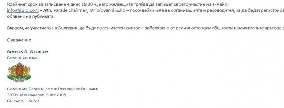 Генерално консулство на Р. България в Чикаго бе потърсено със специална покана към генералния консул и българската общност в града, поради това, че към момента няма записани доброволци за участие.