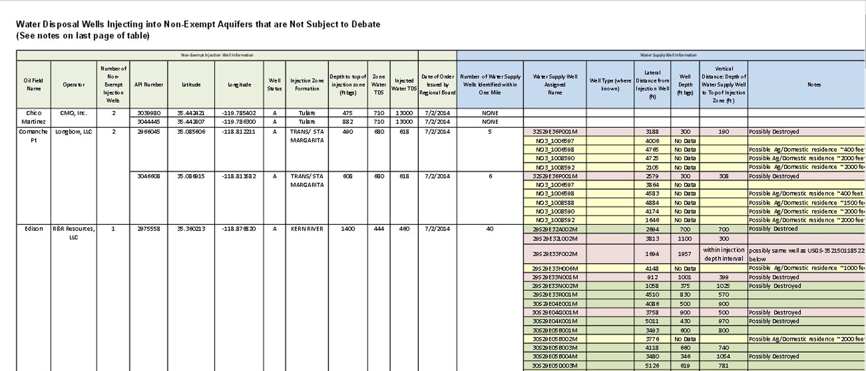 През м. юли щатският Отдел за нефт, газ и геотермални ресурси /state’s Division of Oil, Gas and Geothermal Resources/ затвори 11 инжекционни кладенеца в петролните полета на окръг Керн /Kern County/ и започна да изследва подробно още 100 други, които потенциално замърсяват защитените подземни води. Агенцията за защита на околната среда /The Environmental Protection Agency/, която е върховният законов орган за подземното инжектиране, нареди на щатските служители в срок от 60 дни да дадат оценка на риска от замърсяване на водата и писмото от щатския Воден борд потвърждава, че е имало незаконно замърсяване на много обекти.