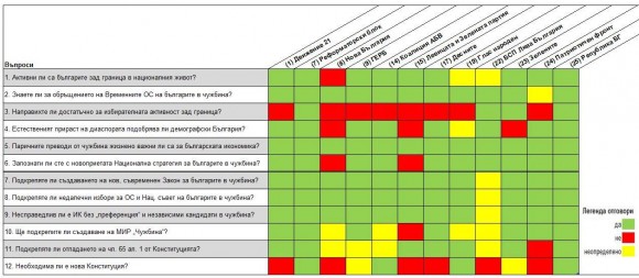За по-лесно разчитане на резултатите, различните отговори сме отбелязали с различни цветове – със зелен цвят са отбелязани положителните отговори, с червен – отрицателните (отговорите НЕ), а с жълт – неопределените отговори. (По-късно ще добавим и колонка с броя на „лайковете“, получени за съответната партия на нашите страници, както и процентът гласове, които те ще съберат на изборите). За да видите таблицата в по-голям размер, кликнете с мишката върху нея.