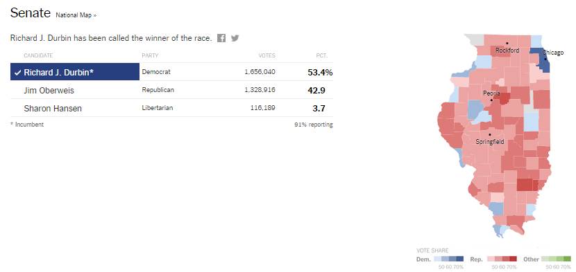 Senate: Senator Richard J. Durbin is re-elected, defeating Jim Oberweis.