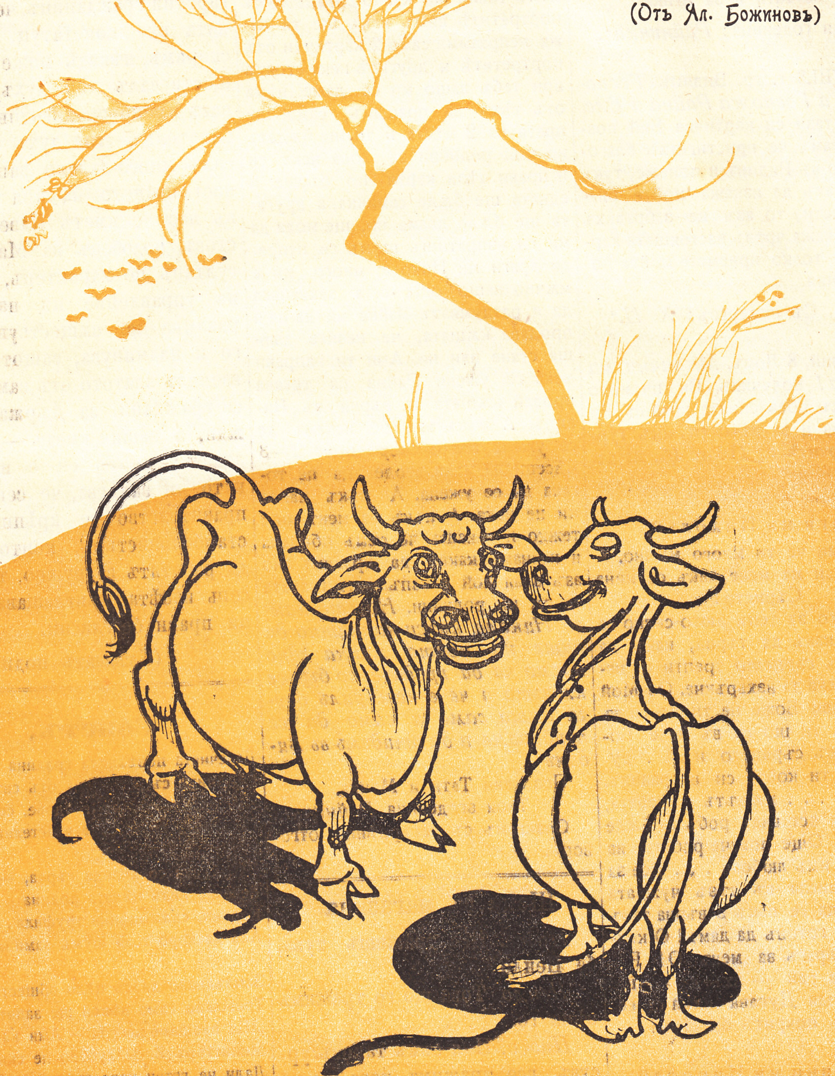 * Карикатурата е публикувана за първи път във в. „Българан“ в далечната 1908 г. В тогавашния момент именитият български художник карикатурист Александър Божинов е осмял желанието на членове на една партия, в случая БЗНС, за лесно придобиване на облаги и постове. Това личи от текста към карикатурата в оригиналния й вариант.