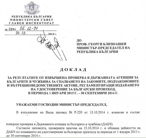 Главният инспекторат на Министерски съвет откри редица противоречиви практики в дейността на Държавната агенция за българите в чужбина (ДАБЧ), които са описани в доклад до министър-председателя Георги Близнашки. Обект на проверка е спазването на законите, подзаконовите и вътрешноведомствените актове за периода 31 януари 2013 г. – 30 септември 2014 г. Проверката беше разпоредена по искане на ресорния вицепремиер Илияна Цанова, след публикации в медиите и сигнал от Министерство на правосъдието.