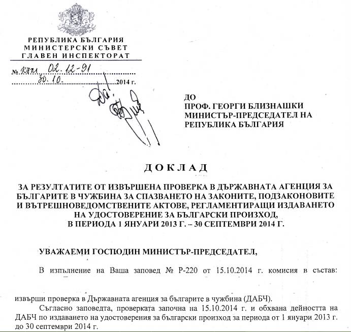 Министър-председателят проф. Георги Близнашки утвърди изводите и препоръките на Главния инспекторат. Копие от доклада ще бъде изпратено на Държавната агенция за българите в чужбина за сведение и изпълнение.