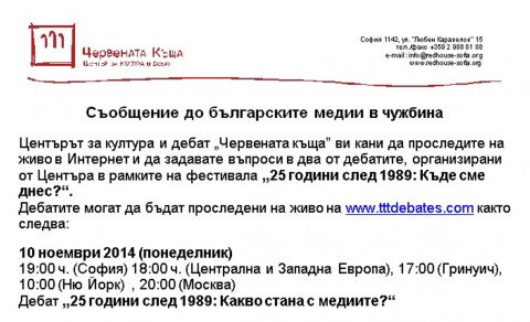 Центърът за култура и дебат „Червената къща” – София кани българските медии в чужбина да проследят на живо в интернет и да задават въпроси в два от дебатите, организирани от Центъра, в рамките на фестивала „25 години след 1989: Къде сме днес?“.