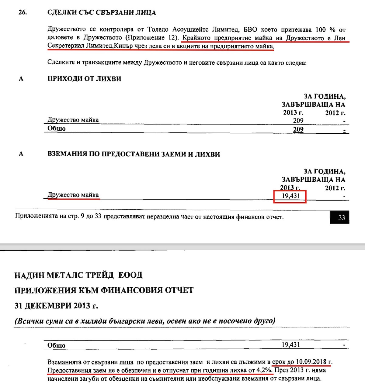 * НАДИН МЕТАЛС ТРЕЙД отчита за 2013 г. 5,6 млн. лв. загуба и предоставен заем от 19,4 млн. лв. на дружеството майка ТОЛЕДО АСОУШЕЙТС ЛИМИТИД(ВИРДЖИНСКИ О-ВИ).