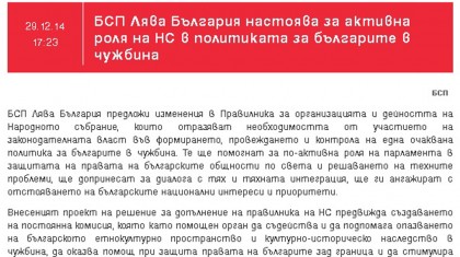 БСП Лява България ще настоява за активна роля на Народното събрание в политиката за българите в чужбина. Това може да се разбере от официално съобщение, качено в сайта на БСП. Следва цялото съобщение.