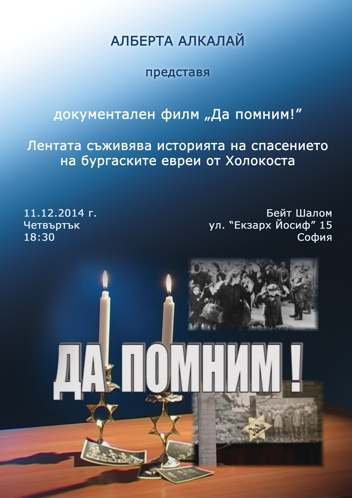 „Да помним” е 30-минутен филмов разказ за бургаските евреи и тяхната изпълнена с превратности съдба. Историята започва с пълноценното участие на еврейската общност във всички сфери на икономическото и културно развитие на града от началото на ХХ век. Филмът на Алберта Алкалай е автентична и емоционална ретроспекция към страшните години на Холокоста. Той търси причините за проявения тогава уникален обществен и личен морал на съпротива срещу античовешките закони за масово изтребление на евреите.