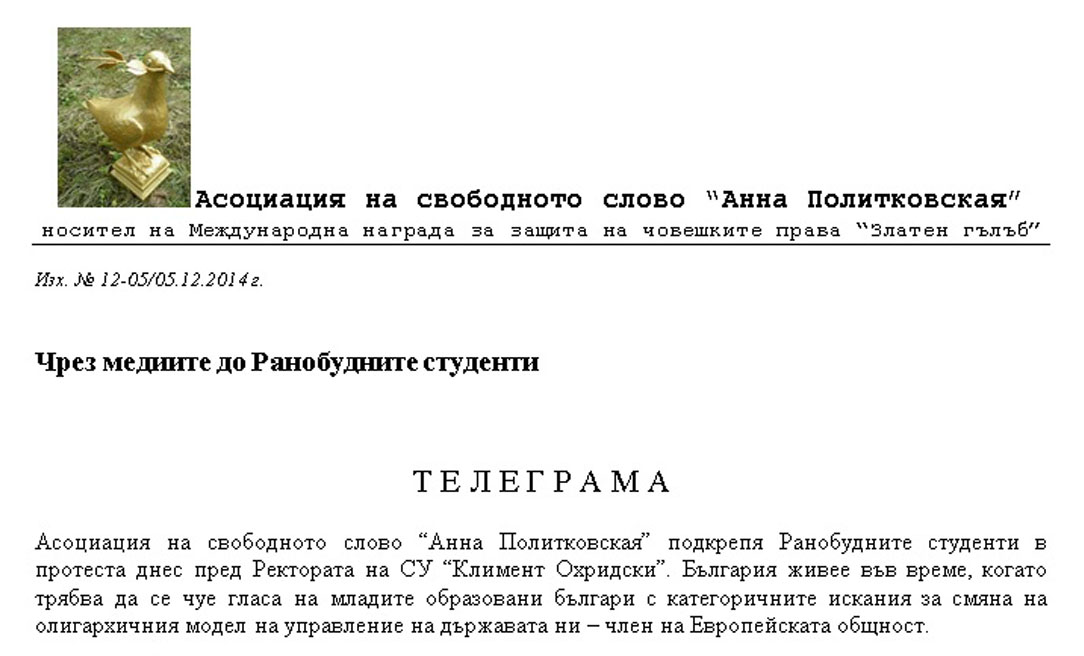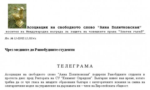 Асоциацията на свободното слово „Анна Политковская“ се обърна днес чрез медиите до „Ранобудните студенти“, за да изрази подкрепата си за техния протест пред Ректората на СУ „Св. Климент Охридски“ в София, за смяна на олигархическия модел на управление на страната. „Ранобудните студенти“ организират пореден протест срещу назначаването на Волен Сидеров за заместник-председател на парламентарната комисия по външна политика, избирането на Делян Пеевски за член на парламентарната комисия по икономическа политика и туризъм, и избирането на Слави Бинев за председател на парламентарната комисия по културата и медиите. Протестът е насрочен за 18.00 ч. българско днес пред централния вход на университета.