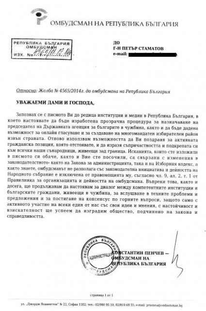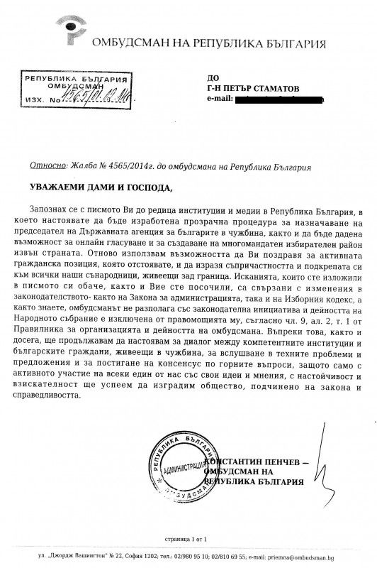 Омбудсманът Константин Пенчев пише в отговора си, че исканията, заложени в писмото, са свързани с изменения на законодателство – на Закона за администрацията и на Изборния кодекс – а неговите правомощия не включват законодателна инициатива. Г-н Пенчев пише още, че той ще продължава да настоява „за диалог между компетентните институции и българските граждани, живеещи в чужбина, за вслушване в техните проблеми и предложения, и за постигане на консенсус по горните въпроси“.