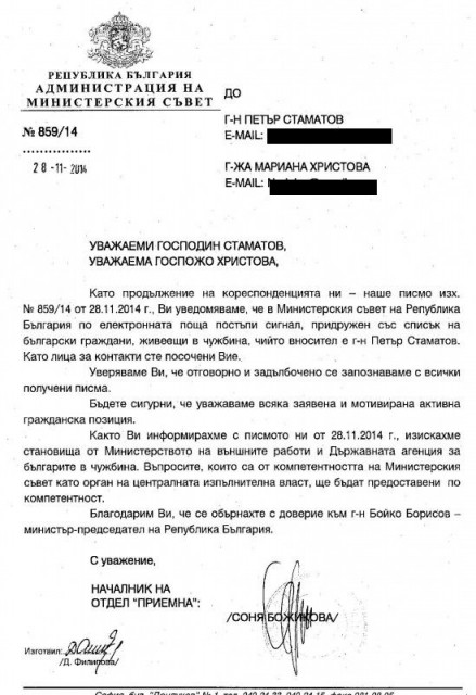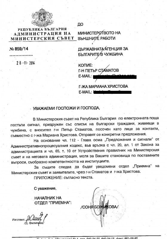 Администрацията на Министерски съвет, в лицето на началника на отдел „Приемна“ Соня Божикова, реагира на изпратеното писмо от българи зад граница с официално писмо, изпратено до МВнР и ДАБЧ, с което тези институции са сезирани да изпратят свои становища по направените конкретни предложения.