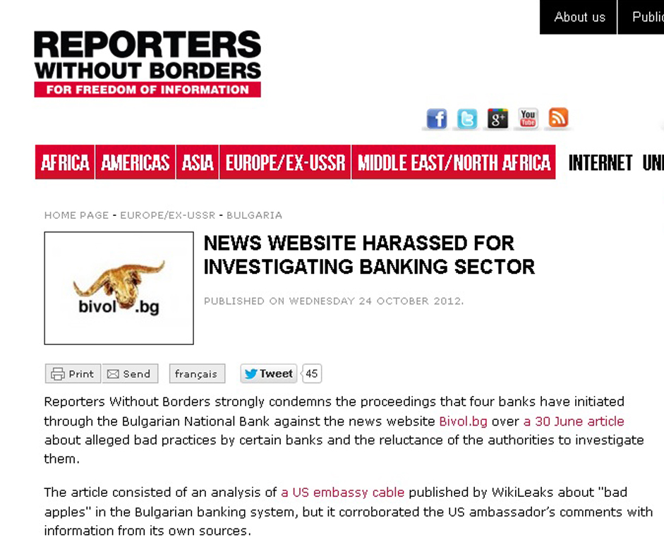 България не беше ставала обект на специална реакция срещу свободата на медиите от около 3 години. Предишният такъв случай беше през 2012 г. след публикацията на дипломатически доклад на посланик Байърли за банките „гнили ябълки“ в българската банкова система, които се занимават с „пране на пари от организираната престъпност и кредитиране на свързани лица“. Четири от „гнилите ябълки“: ПИБ, КТБ, Инвестбанк и ЦКБ поискаха от БНБ да наложи глоба на сайта, а БНБ изпрати заплашително писмо. Тогава също Репортери без граници защити правото ни, гарантирано и от Конституцията, да търсим и предоставяме достоверна информация (виж тук и тук). Tемата обаче остана табу за почти всички български медии с няколко ярки изключения: БНР, „Капитал“ и Е-вестник.