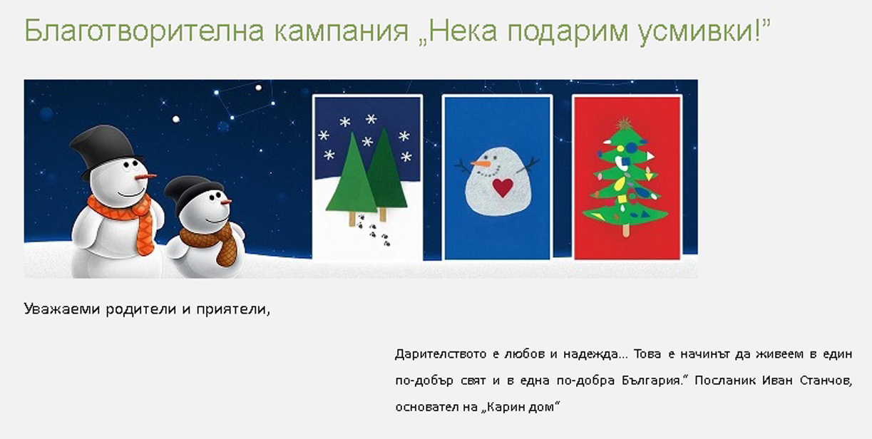 - Продажба сред нашите ученици и техните родители на календари и коледни картички, рисувани от децата, лекуващи се в „Карин дом” – £365. Ръководството на училището ни благодари на г-жа Милена Везенкова, директор на българските училища „В. Левски” в кв. Баркинг и „Розова долина” в кв. Тотнъм – гр. Лондон, която осигури безплатния транспорт на календарите и картичките от България до Лондон.