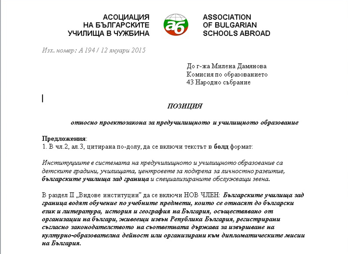 Становище на Асоциацията на българските училища в чужбина относно проектозакона за предучилищното и училищното образование, изпратено до председателката на Комисията по образованието в българското Народно събрание.