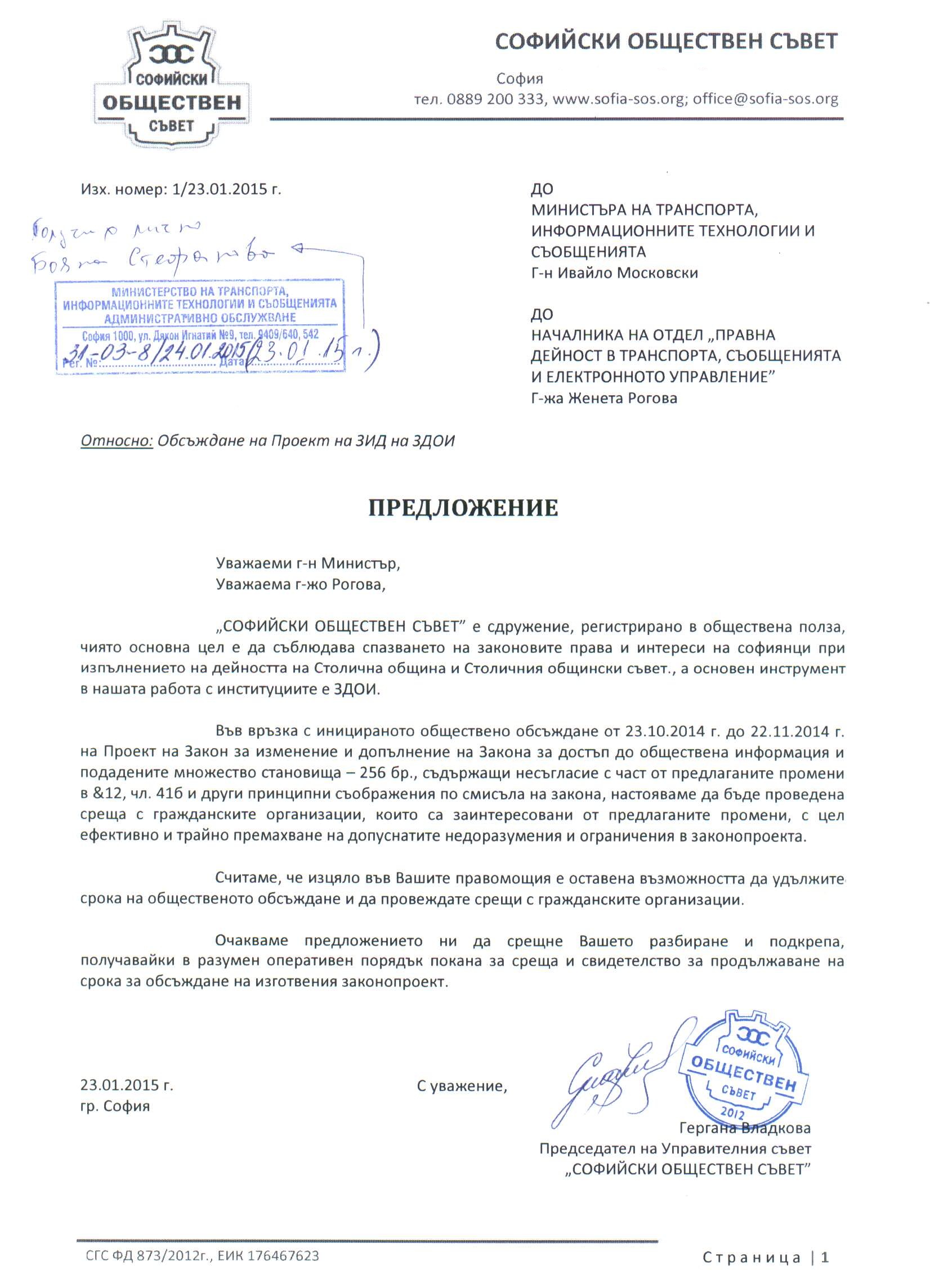Сдружение „Софийски обществен съвет“ е изпратило до българския министър на транспорта, информационните технологии и съобщенията Ивайло Московски и до началника на отдел „Правна дейност в транспорта, съобщенията и електронното управление“ в министерството Женета Рогова предложение във връзка с проекта за изменение на Закона за достъп до обществена информация. Документът е подписан от Гергана Владкова, председател на Управителния съвет на сдружението, което информира за това на своя сайт. В предложението се казва: