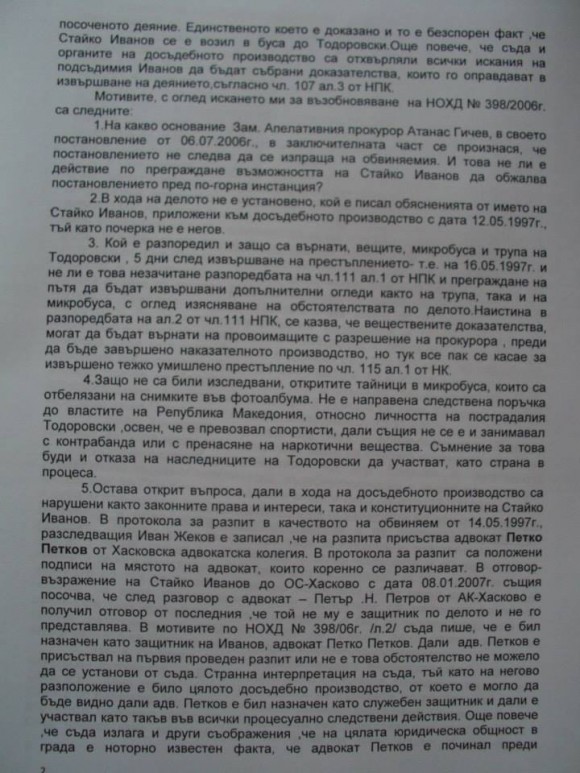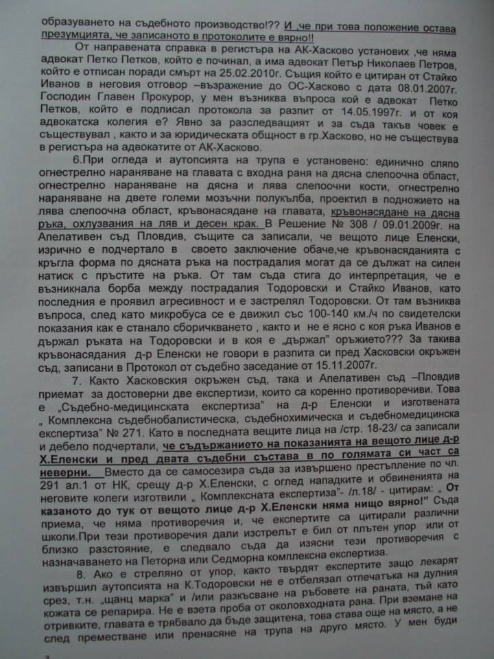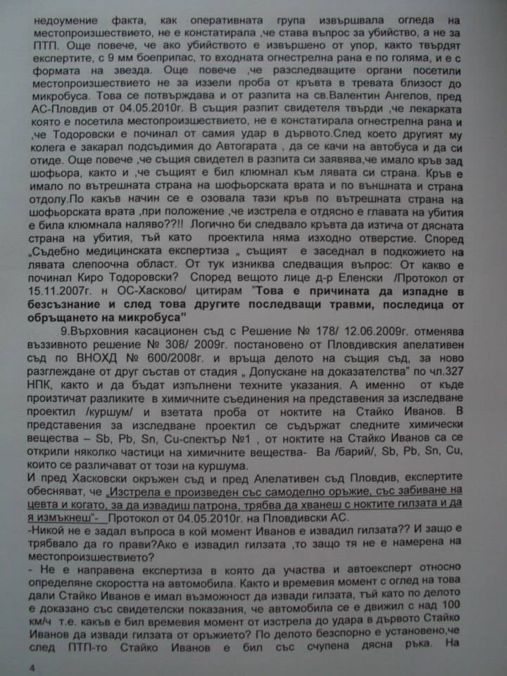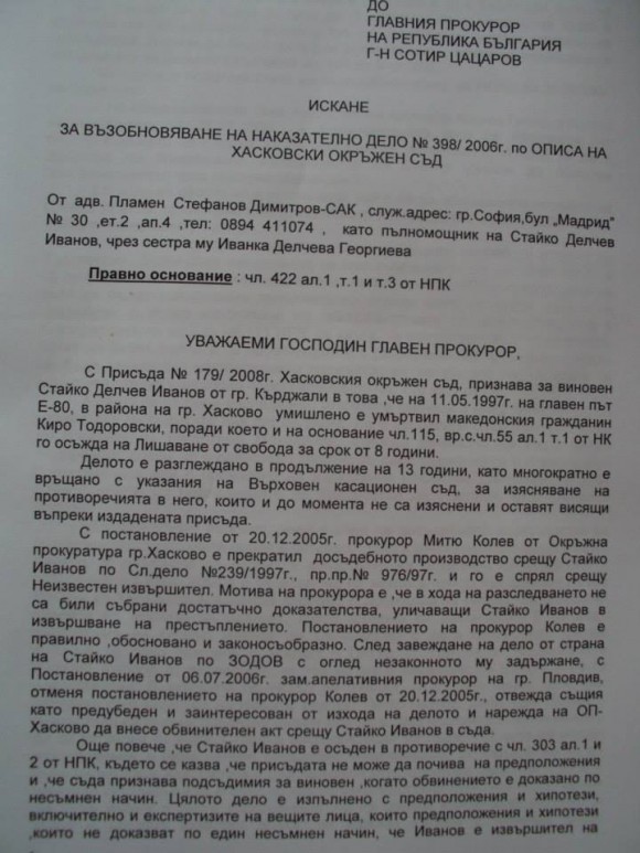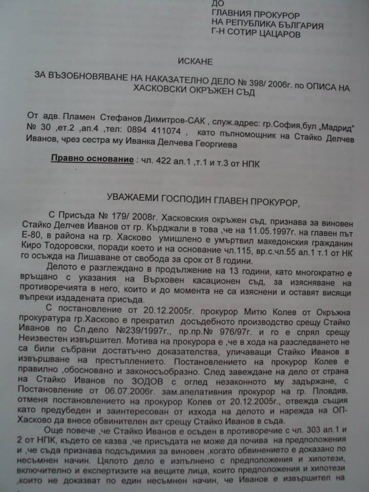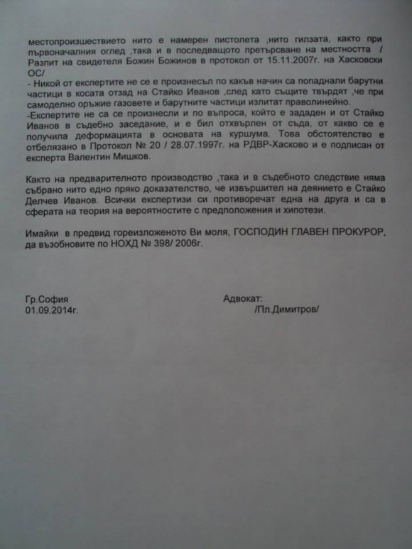 Миналата есен адвокат Пламен Димитров внася жалба с № 10026/ 2.09.2014 г. до български главен прокурор Сотир Цацаров. В жалбата се посочват много неизяснени обстоятелства, свързани с този казус и с доказването на невинността на Стайко Иванов. Факсимилета от страниците й могат да се видят по-долу.