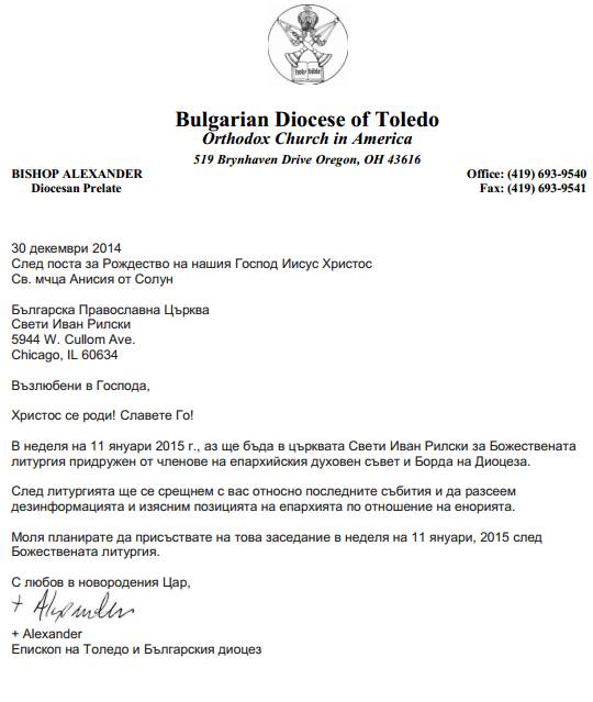В предпоследния ден на изминалата година епископът на Българския диоцез към Православната църква на Америка изпрати следното съобщение до църквата „Св. Иван Рилски“ в Чикаго: