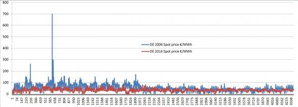 Сега ще ви покажа две графики, отразяващи динамиката на цените на тока във Федерална република Германия, почасови борсови цени за първите половини на годините 2006-та и 2014-та.