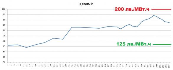 На последната графика поставих и два важни маркера. Долният – зеленият показва цената, на която в момента Националната електрическа компания (НЕК) продава електроенергията на ЕРП-тата, а после те на нас. Превърнете тази цена в евро и сравнете със средната цена на борсата в Германия (според мен тя е около 40 евро/МВт.ч ?). А горният – червеният маркер отразява апетитите на робовладелците ни да продават. В края на миналата година директорът на НЕК заяви, че за да не „фалирали“ (разбирайте – за да не пресъхва потокът на кражбАта), трябва да започнат да продават тока на ЕРП-тата на цена от 200 лева/МВт.ч!!! Воала!