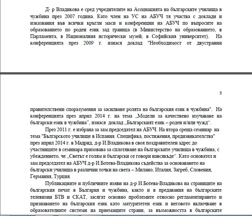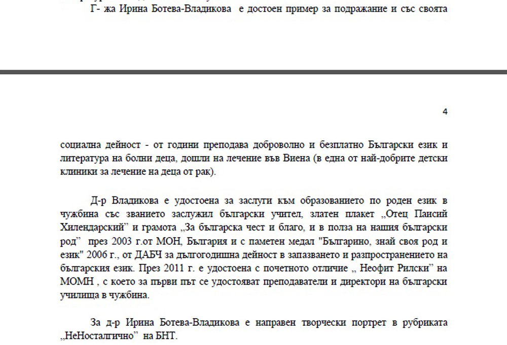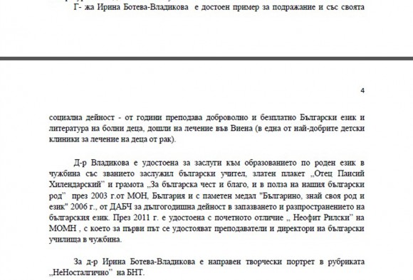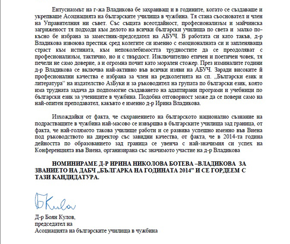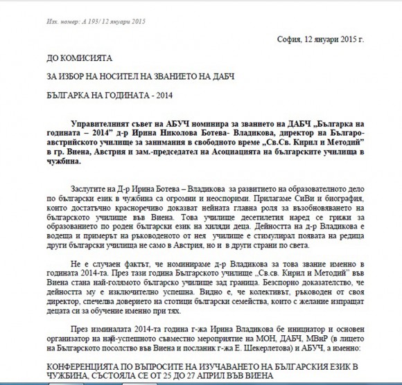 Следва съдържанието на писмото УС на АБУЧ до Комисията за избор на носител на званието на ДАБЧ „Българка на годината – 2014“, подписано от председателя на АБУЧ д-р Боян Кулов. Както и съдържанието на друга информация, изпратена от АБУЧ до Комисията за избор, в която многостранната дейност и професионалната биография на д-р Ирина Ботева-Владикова са представени подробно.