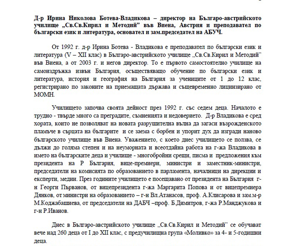 За д-р Ирина Ботева-Владикова и Българо-австрийското училище „Св. Св. Кирил и Методий“ във Виена