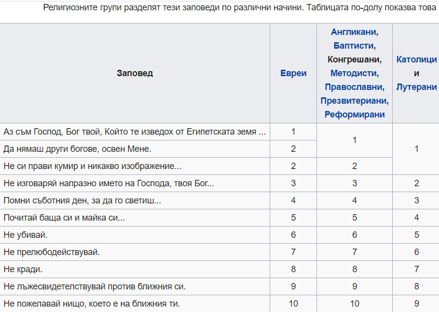 10. Не пожелавай дома на ближния си; не пожелавай жената на ближния си, (нито нивата му) нито роба му, ни робинята му, ни вола му, ни осела му, (нито никакъв негов добитък) – нищо, което е на ближния ти.
