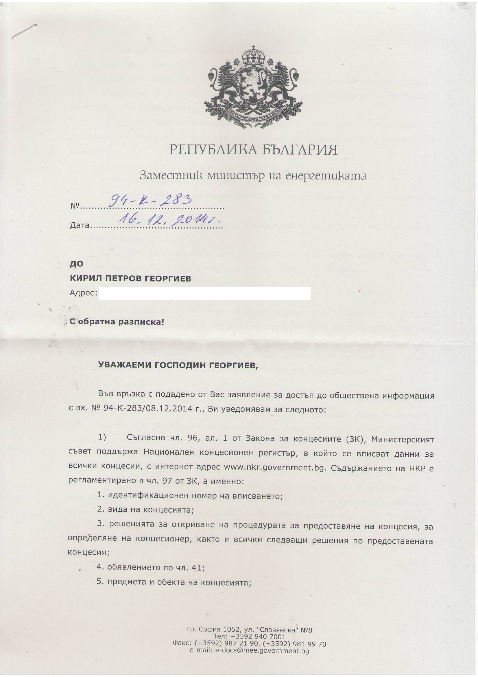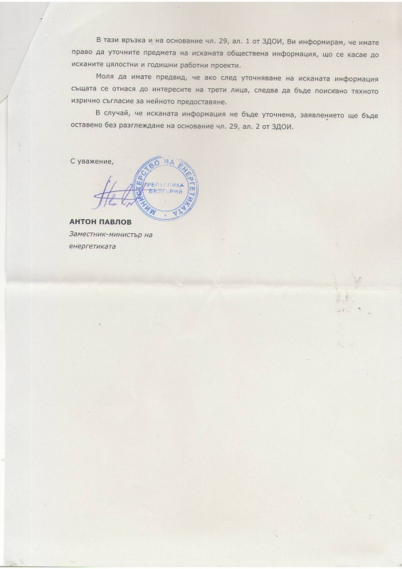 Антон Павлов, зам. министър на енергетиката в българското правителство, е отказал достъп до поискана обществено значима информация, свързани с нефтените и газовите концесии на територията на Р. България. Повече за този отказ и коментар по него можете да прочетете по-долу, в текст на Сърнела Воденичарова, който е постнат и се разпространява във Фейсбук. Публикацията съдържа и факсимиле от официалния отговор на зам.министъра, с който той отказва поискана информация за тези концесии. Информацията е била поискана по ЗДОИ от българския гражданин Кирил Петров Георгиев.