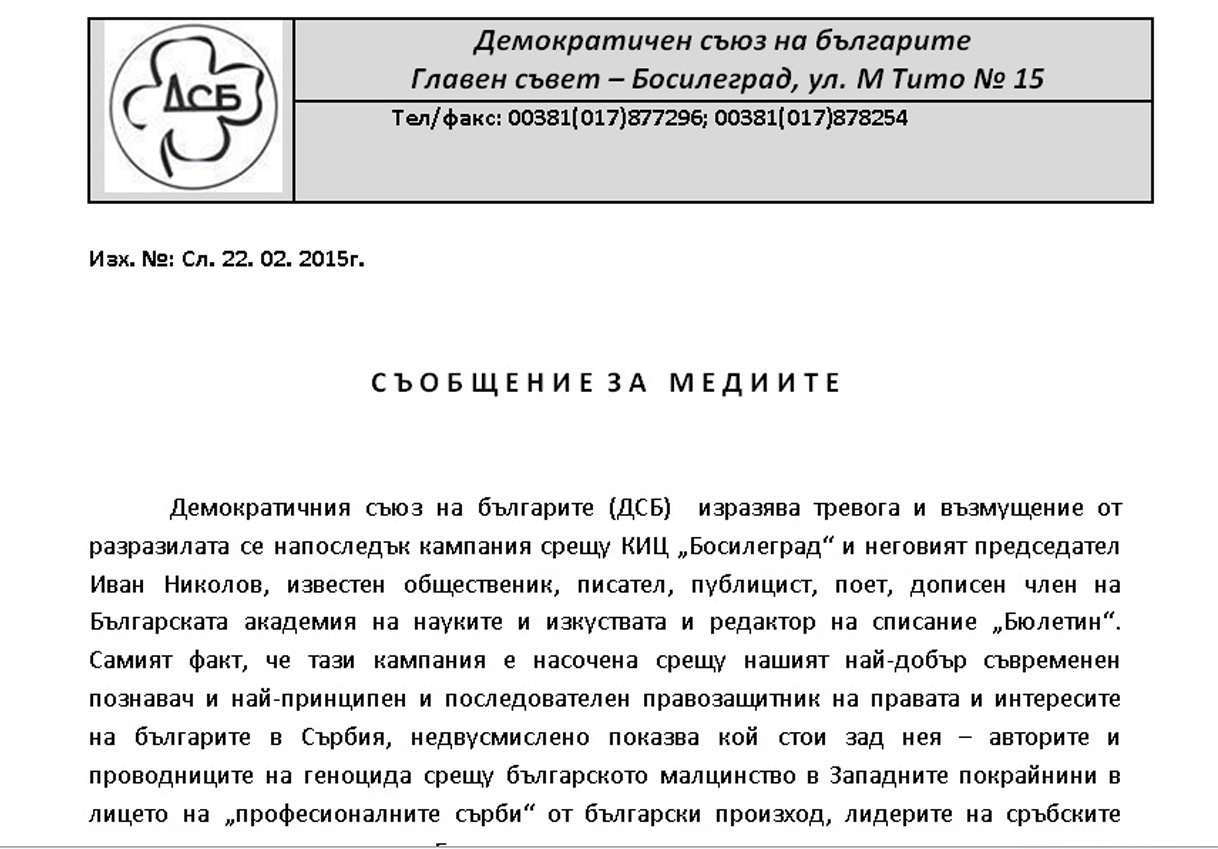Демократичния съюз на българите (ДСБ) изразява тревога и възмущение от разразилата се напоследък кампания срещу КИЦ „Босилеград“ и неговият председател Иван Николов – известен общественик, писател, публицист, поет, дописен член на Българската академия на науките и изкуствата, и редактор на списание „Бюлетин“. Самият факт, че тази кампания е насочена срещу нашият най-добър съвременен познавач и най-принципен и последователен правозащитник на правата и интересите на българите в Сърбия, недвусмислено показва кой стои зад нея – авторите и проводниците на геноцида срещу българското малцинство в Западните покрайнини, в лицето на „професионалните сърби“ от български произход, лидерите на сръбските националистически партии и Босилеградските управници.