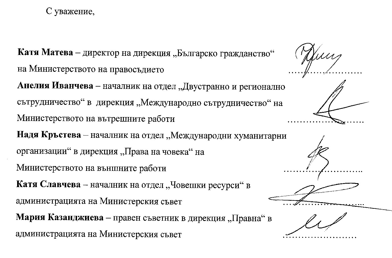 Докладът е подписан от: Катя Матева – директор на дирекция „Българско гражданство“ на Министерството на правосъдието; Анелия Иванчева – началник на отдел „Двустранно и регионално сътрудничество“ в дирекция „Международно сътрудничество“ на МВнР; Надя Кръстева – началник на отдел „Международни хуманитарни организации“ в дирекция „Права на човека“ на МВнР; Катя Славчева – началник на отдел „Човешки ресурси“ в администрацията на Министерски съвет; Мария Казанджиева – правен съветник в дирекция „Правна“ в администрацията на Министерски съвет.