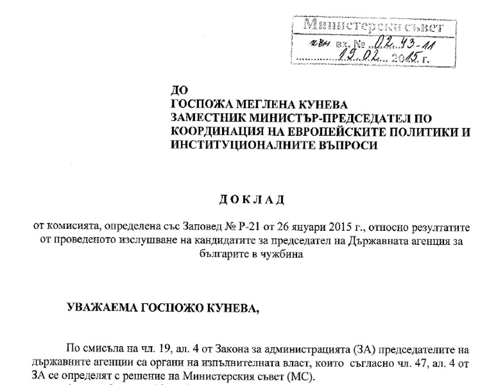 Пълното название на документа е: Доклад на комисията, определена със Заповед № Р-21 от 26 януари 2015 г., относно резултатите от проведеното изслушване на кандидатите за председател на Държавната агенция за българите в чужбина, до заместник министър-председател по координация на европейските политики и институционалните въпроси Меглена Кунева.