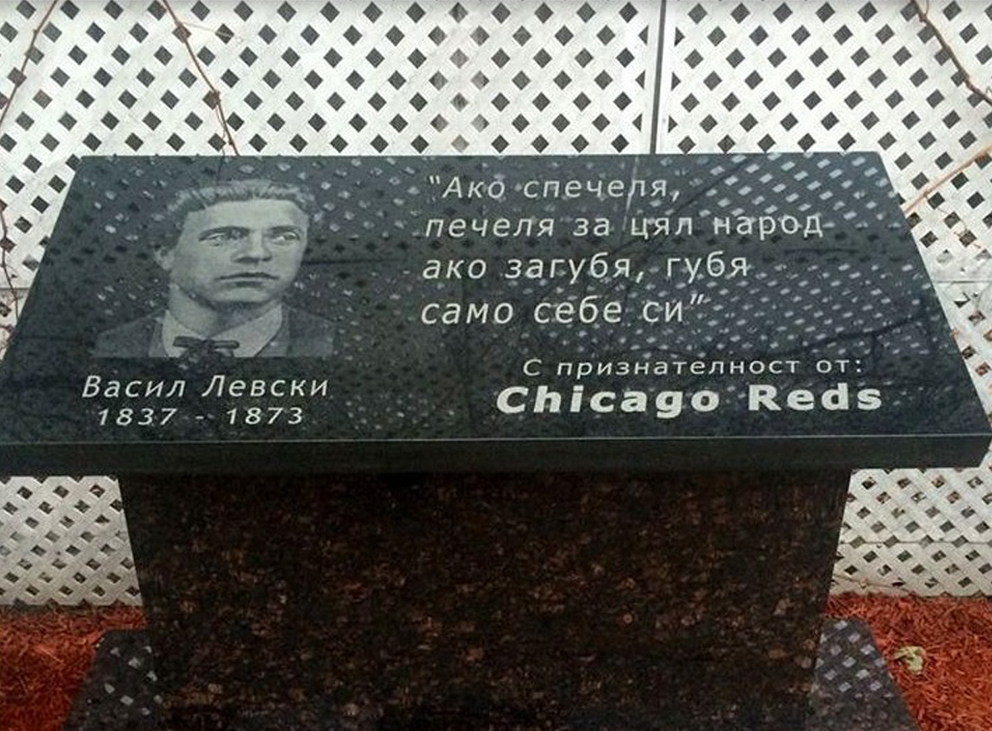 С благодарност към тези, които поставиха неговия портрет и име на паметна плоча в църквата „Света София” в Чикаго, за да можем и тук, извън родината, да тачим нашия кумир за свобода – Васил Левски.
