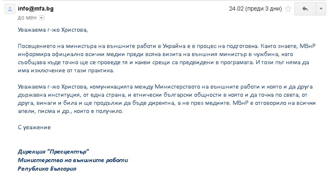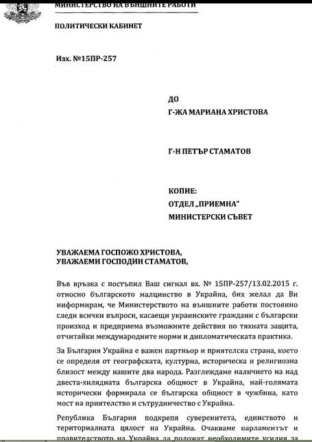 Във връзка с наши писма до Министерски съвет, Външно министерство, Президентството и Народното събрание, от кабинета на българския външен министър Даниел Митов ни изпратиха днес отговор. Писмата съдържаха линкове към публикувани в нашето издание, съответно на 5.02.2015 г. и на 17.02.2015 г., апели на етнически българи от Украйна към българските институции, в т.ч. и Външно министерство (линкове към апелите – тук и тук). Този отговор идва днес, след като Администрацията на МС поиска с писма, съответно от 10.02.2015 г. и от 19.02.2015 г., становища на МВнР, във връзка с тези апели на българи от Украйна (вж. тук и тук).