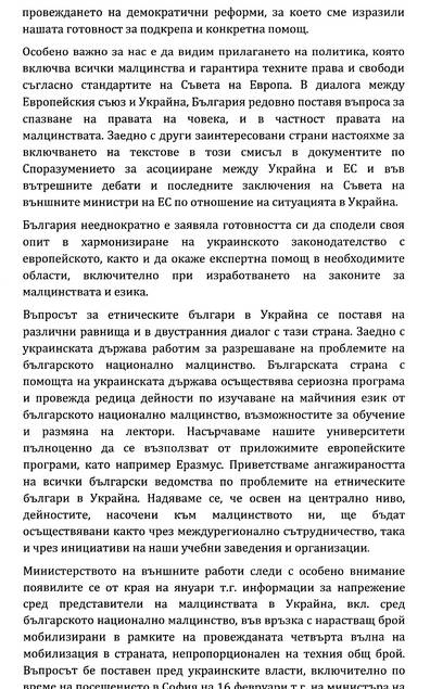 Останалата част от отговора е посветена на известни или подразбиращи се неща като това, че България и Украйна са приятелски страни; че България е заявявала много пъти желанието си да сподели своя опит с Украйна по отношение на хармонизирането на нейното законодателство с европейското; че въпросът с етническите българи в Украйна много пъти бил поставян на различни равнища в двустранния диалог с Украйна. Както и че българското МВнР е в постоянен диалог с посолството в Киев и с консулството в Одеса, както и с властите в Украйна.