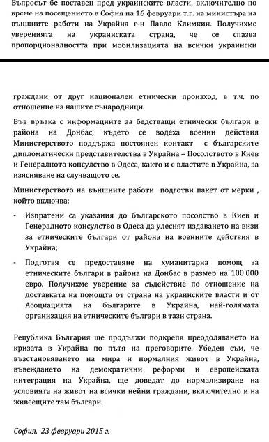 „Изпратени са указания до българското посолство в Киев и до Генералното консулство в Одеса да улеснят издаването на визи за етнически българи от района на военните действия в Украйна; Подготвя се хуманитарна помощ за етническите българи в района на Донбас в размер на 100 хиляди евро“.
