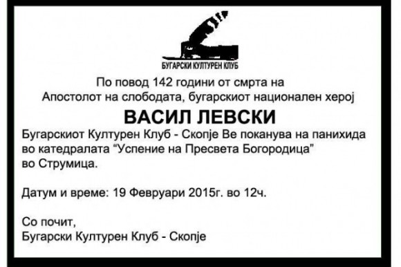За първи път от 70 години отслужиха панихида за Васил Левски в Македония. На 19 февруари родолюбците от Българския културен клуб в Скопие (БККС) почетоха паметта на Апостола на свободата в храма „Успение на Пресвета Богородица“ в гр. Струмица.