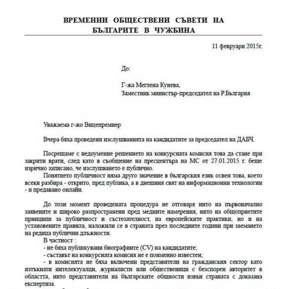 Временните Обществени съвети на българите в чужбина изпратиха днес до вицепремиера, отговарящ за българите в чужбина, Меглена Кунева, поредно писмо* във връзка с проведените изслушвания на кандидатите за председател на ДАБЧ.