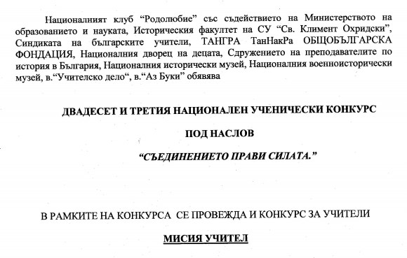Националният клуб “Родолюбие”, със съдействието на Министерството на образованието и науката, Националния дворец на децата, Историческия факултет на СУ “Св. Климент Охридски”, ТАНГРА ТанНакРа Общобългарска фондация, Сдружението на преподавателите по история в България, Синдиката на българските учители, Националния исторически музей, Националния военно-исторически музей, в. “Учителско дело“ и в.“Аз Буки” обявяват 23-тия национален ученически конкурс под надслов „Съединението прави силата“.