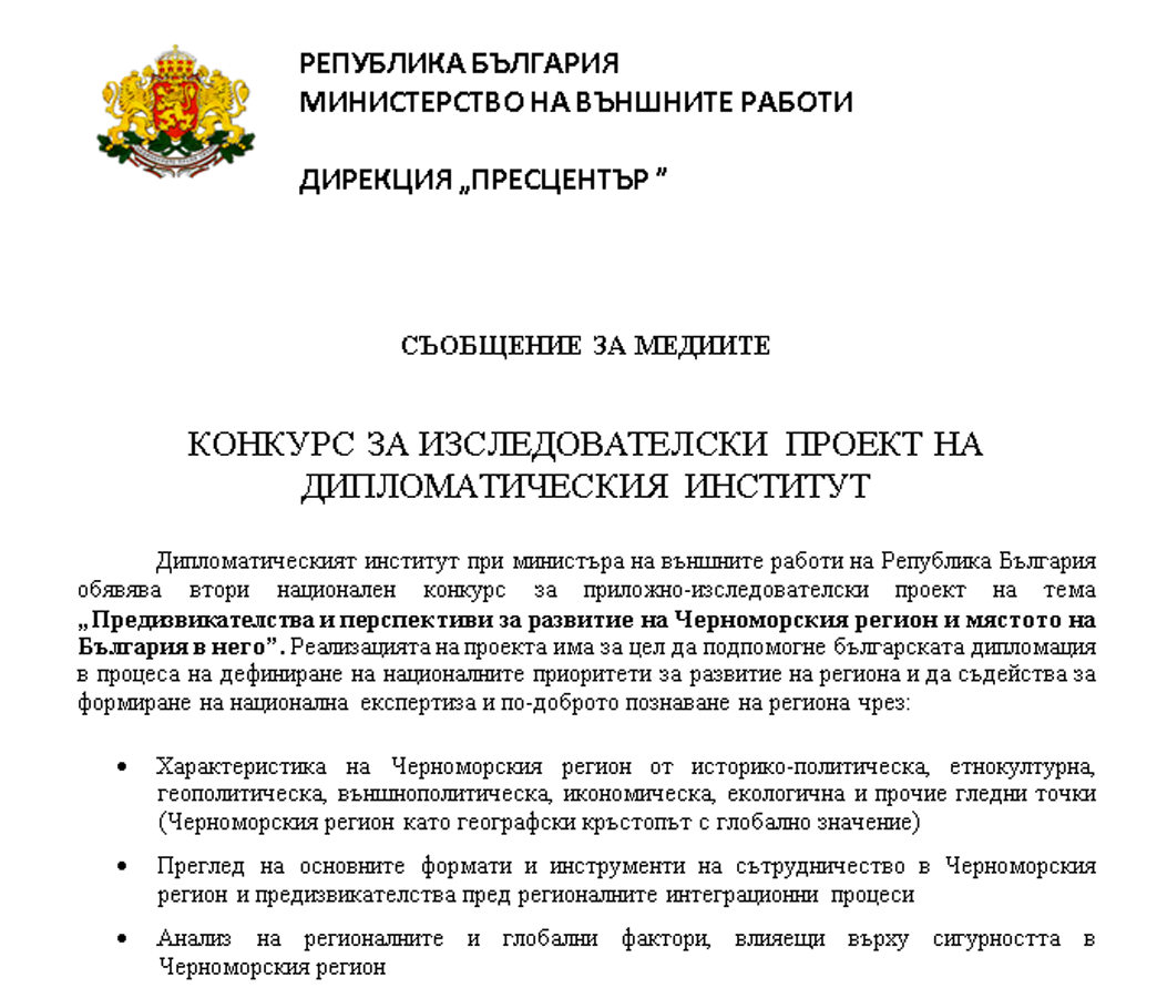 Дипломатическият институт при министъра на външните работи на Р. България обяви втори национален конкурс за приложно-изследователски проект на тема