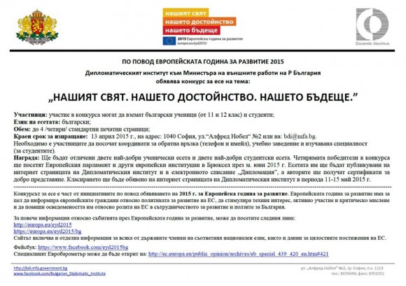 Дипломатическият институт към МВнР обяви Национален конкурс за есе на тема „Нашият свят, нашето достойнство, нашето бъдеще“. Конкурсът се организира по повод обявяването от Европейската комисия на 2015-та за Европейска година на развитието.