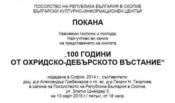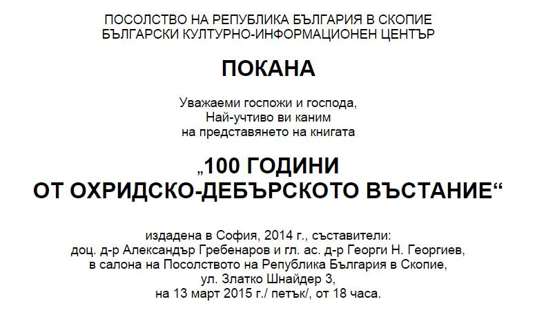 Българското посолство и Българският културно-информационен център в Скопие, Р. Македония, организират представяне на книгата „100 ГОДИНИ ОТ ОХРИДСКО-ДЕБЪРСКОТО ВЪСТАНИЕ“. Съставители на изданието са доц. д-р Александър Гребенаров и гл. ас. д-р Георги Н. Георгиев. Събитието е инициирано и реализирано със съдействието на Българския културен клуб в Скопие.