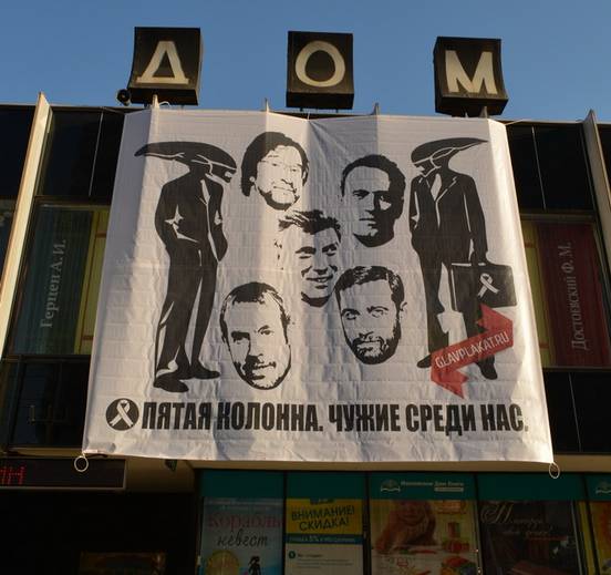 — Баннер «Пятая колона: чужие среди нас», который на днях появился на Новом Арбате, персонально обозначил ту самую «пятую колонну», о которой в марте говорил президент Путин в своем послании Федеральному собранию. Теперь мы знаем в лицо эту «пятую колонну»: это Навальный, Макаревич, Пономарев, Шевчук, Немцов. Ты понимаешь, что это своеобразная «черная метка» для тебя?
